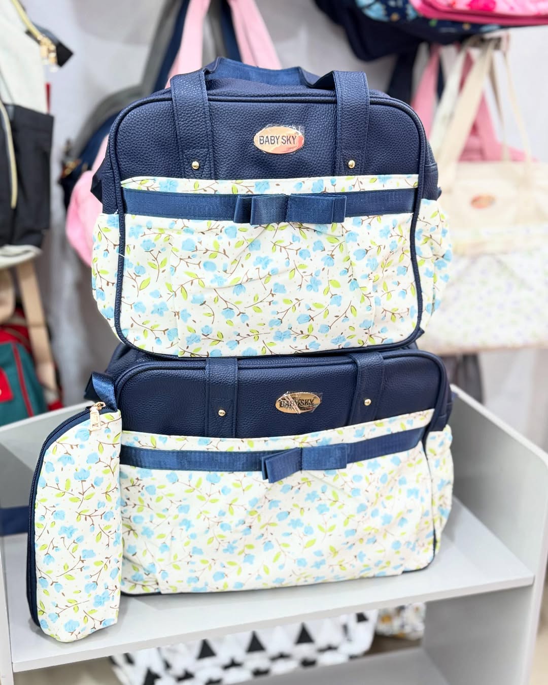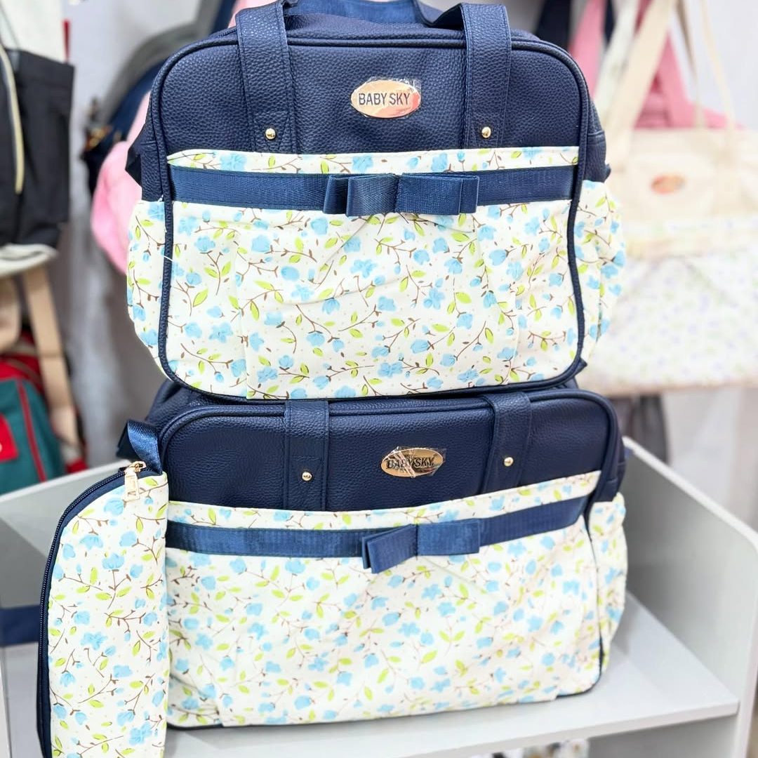 Nuestros hermosos bultos Baby Sky vienen en un juego de 3 piezas (bulto grande, mediano y portabiberón), ideales para cada salida con tu pequeño.